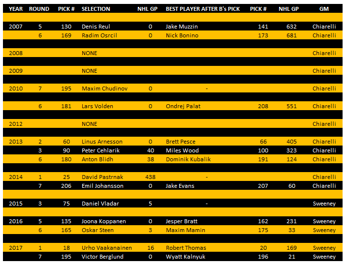 For the most part, Europe wasn’t much of a consideration for Chiarelli and his staff. During the drafts that he oversaw, the Bruins selected just 4 players out of Europe through 6 consecutive entry drafts from 2007 through 2012. Those picks went on to play a total of zero NHL games.