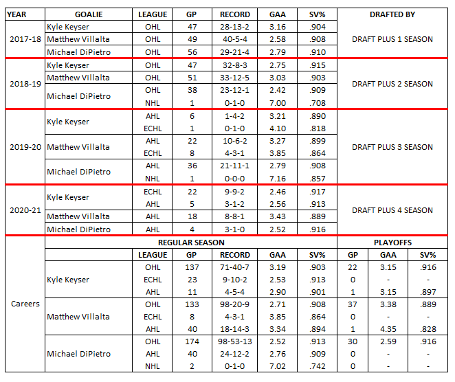 Obviously, I have followed the career paths of DiPietro, Villalta, Keyser and Fulcher since they first broke into the OHL and have continued to follow their careers since then. I want to look at their careers to date following that 2017 draft and compare Keyser to the two goaltenders that were selected.