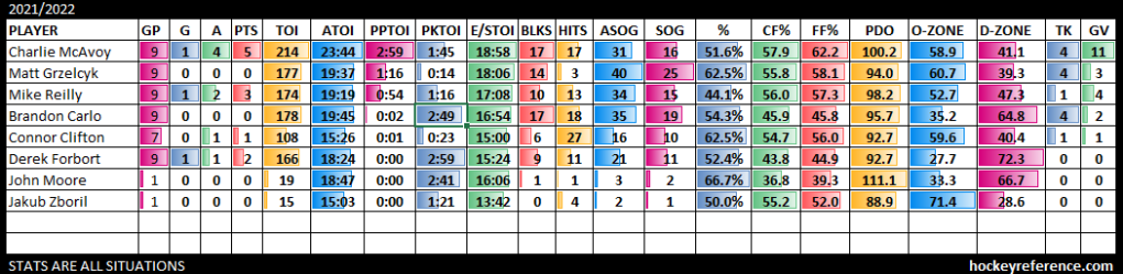The options here are minimal. If you want to pair Forbort with Clifton, they haven’t been bad. But personally, I wouldn’t pair Reilly with Carlo with how they’ve faired this season. Do you give them time to work things out? I would be tempted to keep Grzelcyk with Carlo, at least for now and that leaves you the opportunity to pair Reilly with McAvoy. Through nine games they’ve skated together for 13:09 time on ice and have done pretty well.