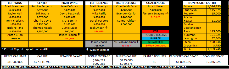 There is some maneuverability here though. Today, the Bruins are carrying 14 forwards. Jesper Froden does not require waivers and Urho Vaakanainen is skating and ready to come off injured reserve. That means Jack Ahcan could and likely would be sent to Providence to bank some cap space. See what happens if those moves were made tomorrow morning: