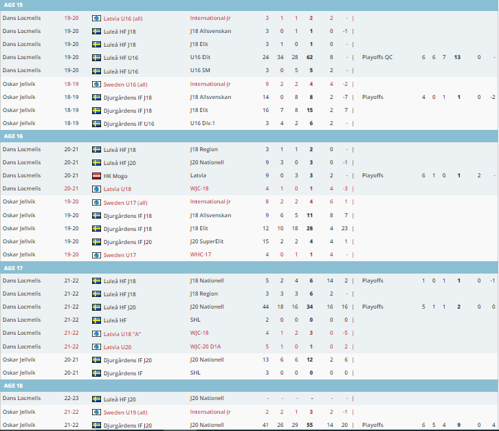 Now let’s look at how the two future Bruins compare to each other from their 15-year-old seasons through to their 18-year-old seasons. Take note that the J20 SuperElit is the same league as the J20 Nationell. Only the league name changed.