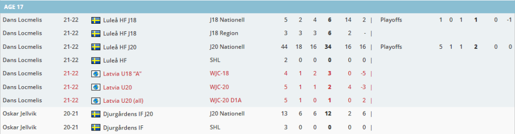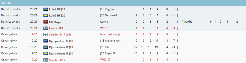 Jellvik has on many occasions played above his age group, while Locmelis has pretty much stayed in his age group except one season – his draft season.
