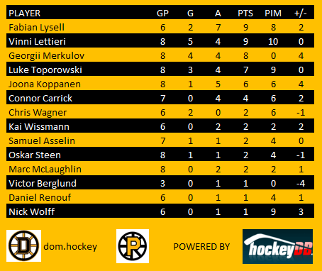 Dans Locmelis is on an 8-game point streak (after a small calling out on this blog I might add). He has 4G and 6A in those 8 games. He’s up to 8th in J20 Nationell League scoring.
