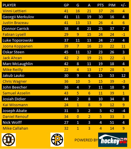Matthew Poitras had another multi assist game Sunday with three. He has points in 10 of his last 12 games with 3 goals and 18 assists. He’s had 6 multi point games in that stretch. His improvement from the start of the season until now is marked, including faceoffs where he is now at 55.9%. Like Harrison, Poitras has spent some time on the wing and 7 of his 12 goals on the season have come while he was riding shot gun.
