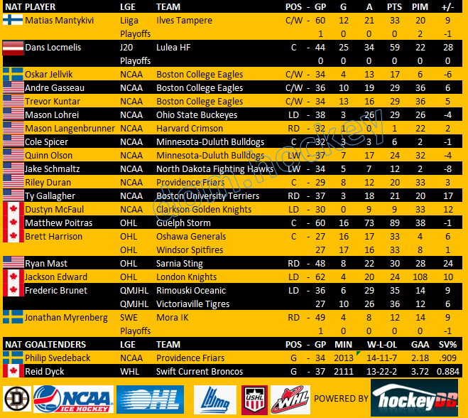 In the J20 Nationell, Lulea HF suffered a heartbreaking loss to Mora IK on Saturday for top spot as league play comes to an end. Lulea will face Frolunda HC in a best-of-three series in Slutspel (playoffs). Dans Locmelis finishes the Top-10 leading the league in scoring with 12 goals and 13 assists in 16 games. Combined with divisional play, he finishes fourth in league scoring with 59 points. His 25 goals had him seventh in combined scoring while his 34 assists ranked third.