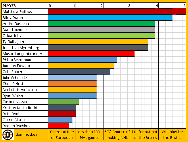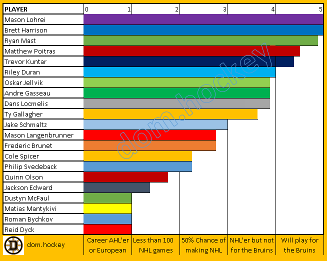 Let’s begin by looking at what I call my “chances” chart. Here, I determine what I believe the chances are of each prospect reaching a certain level. A lot goes into determining whether they will eventually play for the Boston Bruins beyond the skill level of the player. The depth chart and where they rank on that depth chart, their value in trade possibilities and their contractual status are just some of the things that come into play.