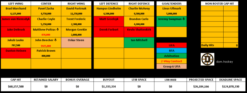 Back on entry level contracts will be Matthew Poitras and John Beecher. Jakub Lauko will be back at a cheap $787,500 cap hit.