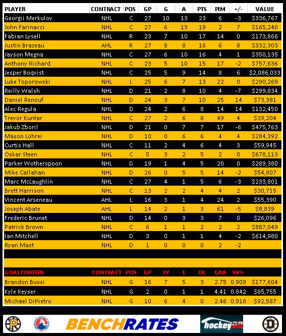 Here’s a look at the Providence Bruins leaders. You will notice a new column called “value” with the Providence Bruins stats. This is provided by our friends at Benchrates. Created by a retired hockey player, Benchrates has created and algorithm that computes values in real time. The value you see below is calculated over more than one season. They do produce a value on the current season only. Give them a look and check out their site.