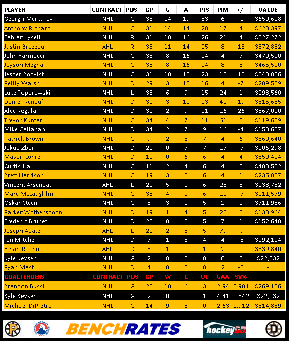 Here’s a look at the Providence Bruins leaders. You will notice a column called “value” This is provided by our friends at Benchrates. Created by a retired hockey player, Benchrates has created and algorithm that computes values in real time. The value you see is the cap hit value they’ve earned this season to date. Give them a look and check out their site.