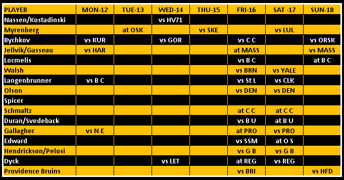Providence College squeezed by Maine 4-3 in overtime. Duran, who didn’t have a SOG, helped set up the tying goal late in the third period to force overtime while Svedeback stopped 22 of 25 shots he faced. PC outshot Maine 32-25 including 1-0 in overtime.