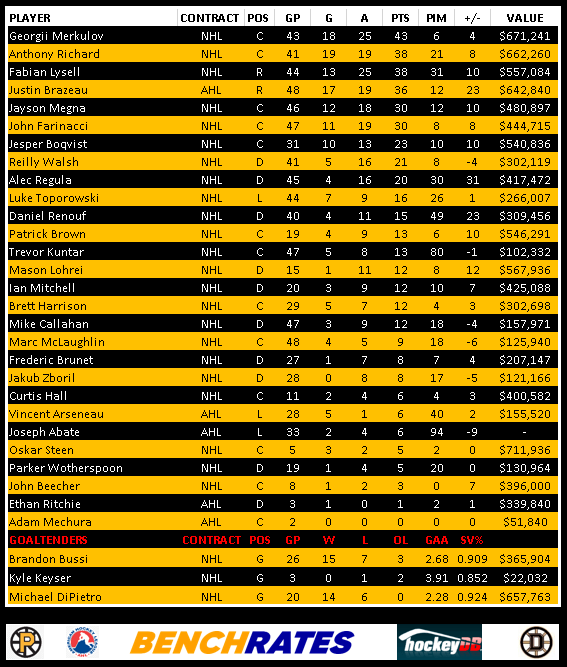 Here’s a look at the Providence Bruins leaders. You will notice a column called “value” This is provided by our friends at Benchrates. Created by a retired hockey player, Benchrates has created and algorithm that computes values in real time. The value you see is the cap hit value they’ve earned this season to date. Give them a look and check out their site.