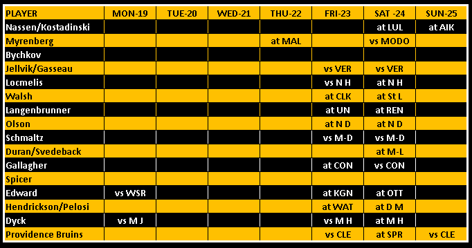 Here’s a look at the Providence Bruins leaders. You will notice a column called “value” This is provided by our friends at Benchrates. Created by a retired hockey player, Benchrates has created and algorithm that computes values in real time. The value you see is the cap hit value they’ve earned this season to date. Give them a look and check out their site.