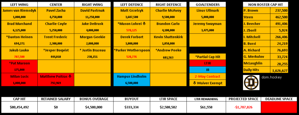 Maroon is currently out while recovering from back surgery. The move put the Bruins over the cap but can easily become compliant by placing Maroon on LTIR – which he had been on with the Wild.