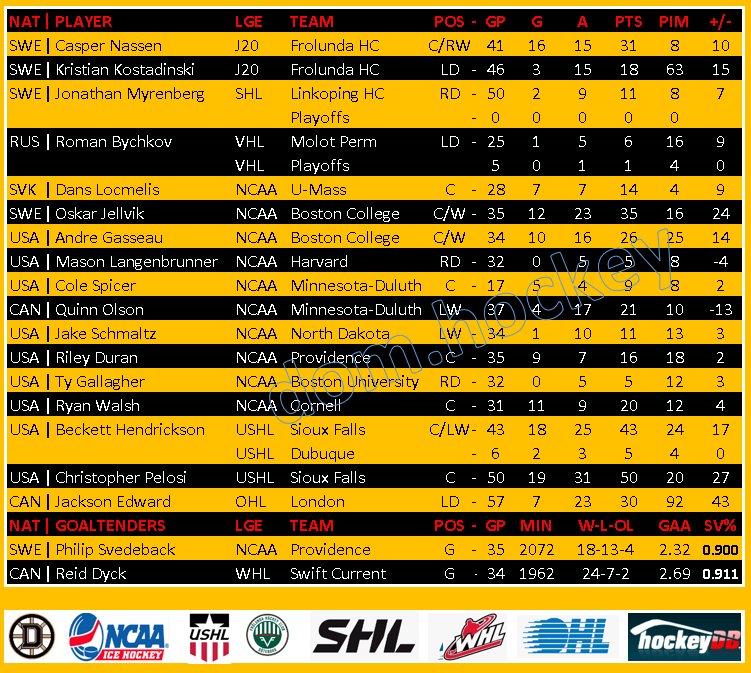 Speaking of U-Mass, they defeated Providence 3-1. Not only did the loss eliminate Providence from advancing in Hockey East, but also eliminated them from NCAA Tournament contention. That means the season is over for Riley Duran and Philip Svedeback. Duran went pointless in the game with 2 SOG while Svedeback stopped 22 of 25 shots he faced. Now we wait to see if Duran wishes to turn pro. On the winning side, Dans Locmelis also went pointless with 1 SOG and as mentioned above, he and his teammates will go on to meet Boston College.
