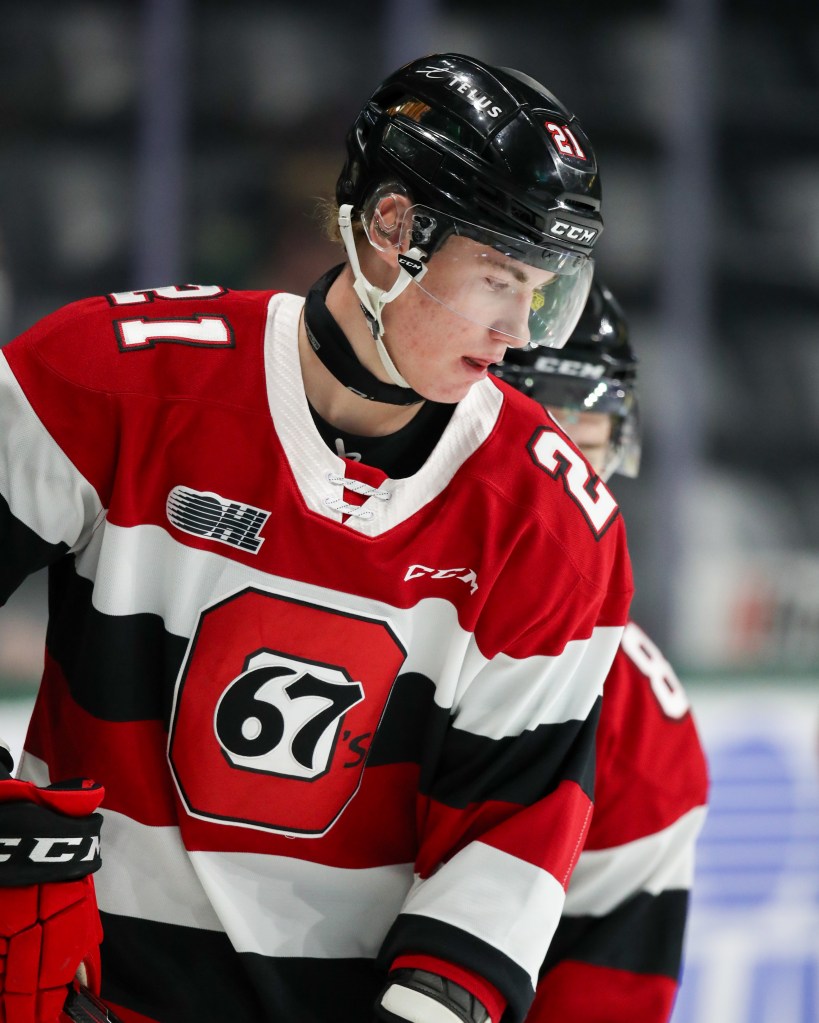 First up is Charlie Hilton who plays for the Ontario Hockey League’s Ottawa 67’s. The 6’5”, 205-pound left wing turns 18 on September 15 and became eligible for the 2024 NHL Entry Draft on the last day. He will re-enter the draft in 2025 but he is eligible to sign as an undrafted free agent if that contract comes before the OHL season begins Hilton has impressive size and knows how to use it effectively. Additionally, he is skilled in puck handling and possesses above-average playmaking abilities from the wing.