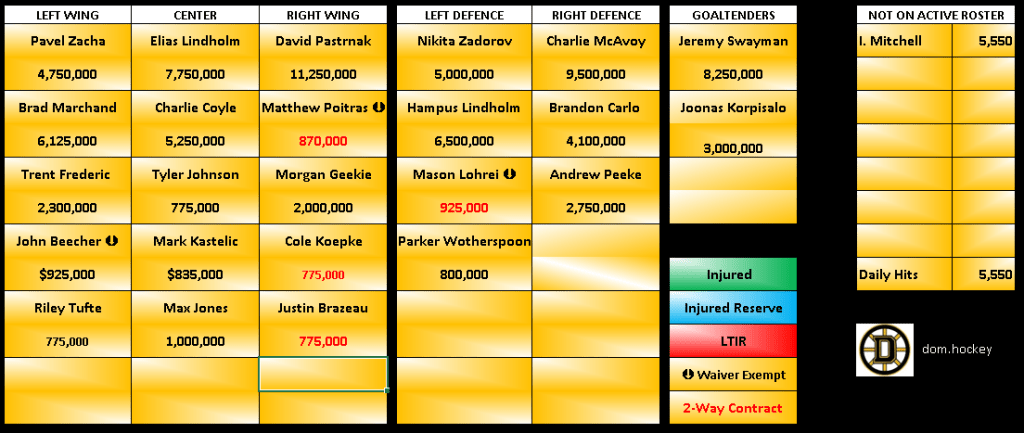 The team has three players who are waiver exempt: Mason Lohrei, John Beecher and Matthew Poitras. They will not drop to six defencemen so Lohrei seems safe. Beecher has solidified a role on what is one of the best 4th lines early into the season. And Poitras has shown that last season was not a fluke and deserves a spot on the roster.