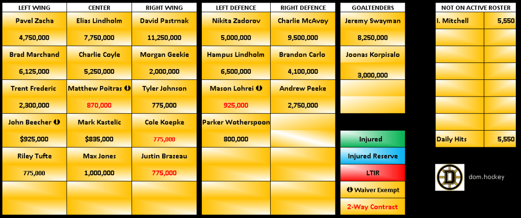 Currently, the Bruins can add an average annual value (AAV) of nearly $424,000, which is still below the league minimum contract of $775,000. By the end of their current road trip, they will have banked $440,000, but this amount still falls short of the league minimum.