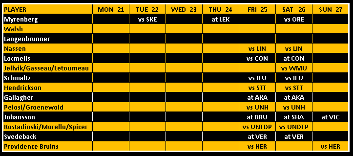 In the NCAA, Robert Morris defeated Miami (Ohio) 5-1 in a non-conference match. Casper Nassen finished the game a minus-1 and without a shot on goal. Nassen’s modest 3-game point streak came to an end.