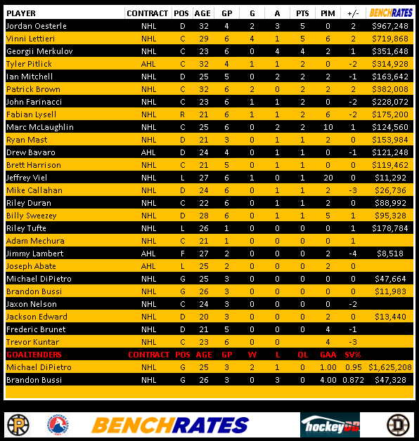 Here’s a look at the Providence Bruins leaders. You will notice a column called “Benchrates” This is provided by our friends at Benchrates. Created by a retired hockey player, Benchrates has created an algorithm that computes values in real time. The value you see is the cap hit value they’ve earned this season to date. Give them a look and check out their site.