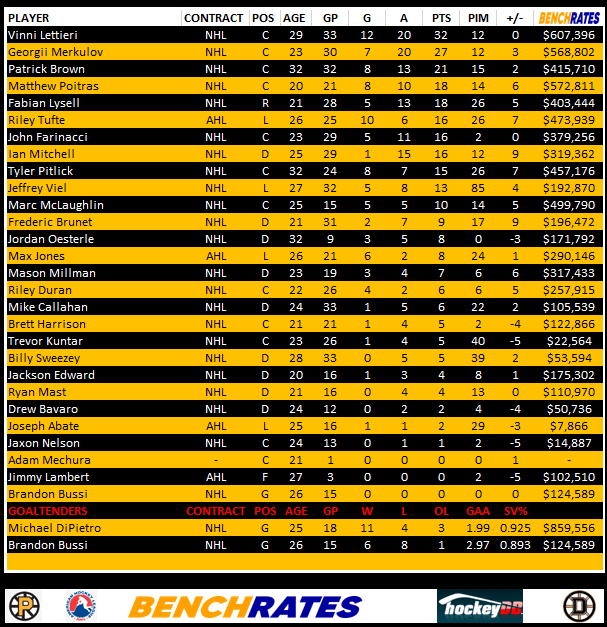 Here’s a look at the Providence Bruins leaders. You will notice a column called “Benchrates” This is provided by our friends at Benchrates. Created by a retired hockey player, Benchrates has created an algorithm that computes values in real time. The value you see is the cap hit value they’ve earned this season to date. Give them a look and check out their site.