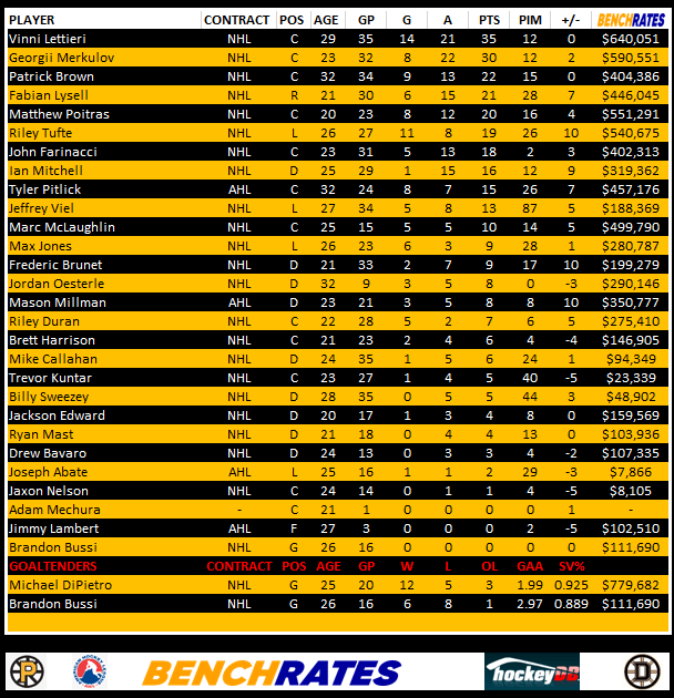 Here’s a look at the Providence Bruins leaders. You will notice a column called “Benchrates” This is provided by our friends at Benchrates. Created by a retired hockey player, Benchrates has created an algorithm that computes values in real time. The value you see is the cap hit value they’ve earned this season to date. Give them a look and check out their site.