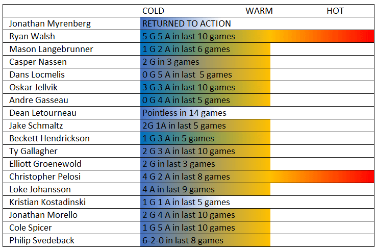 Myrenberg finally got into action on Thursday after missing 33 games to start the season. I wish I could say he didn’t miss a beat, but that isn’t true. It was clear this was his first game while everyone else is halfway through the season. Myrenberg finished a minus-1 with 14:45 TOI.