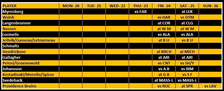 Minnesota defeated Notre Dame 5-2 on Friday. Hendrickson, who began the night on the fourth line had two helpers, including on the game winner when he picked up a puck behind the opposition net, came around for the wrap around and the rebound went to a teammate for the goal. On the second, he read the play behind the net perfectly, was first on the pack in the corner and a split second later it was out in front to a teammate for a perfect tic-tac-goal. He finished a plus-2 with 6 SOG in just 10:14 TOI.