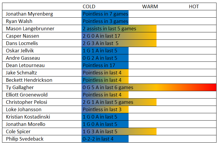 On Saturday, Linkoping fell 2-1 to Rogle. Myrenberg did not factor in on Linkoping’s only goal. He played 16:16 and has 1 SOG with 2 hots and 2 blocks. With only 12 games remaining on the season, time is running out for Linkoping. The return of Myrenberg hasn’t resulted in wins but he has helped reduce their goals against and helped them in transition and getting out of their end. They will need more to get out of the relegation round.