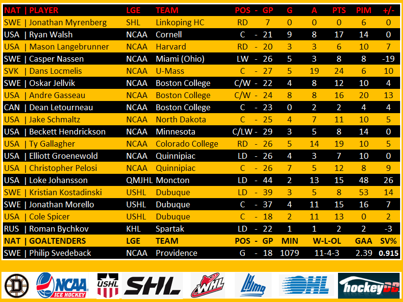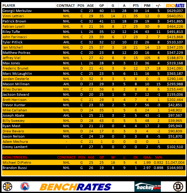 Here’s a look at the Providence Bruins leaders. You will notice a column called “Benchrates” This is provided by our friends at Benchrates. Created by a retired hockey player, Benchrates has created an algorithm that computes values in real time. The value you see is the cap hit value they’ve earned this season to date. Give them a look and check out their site.