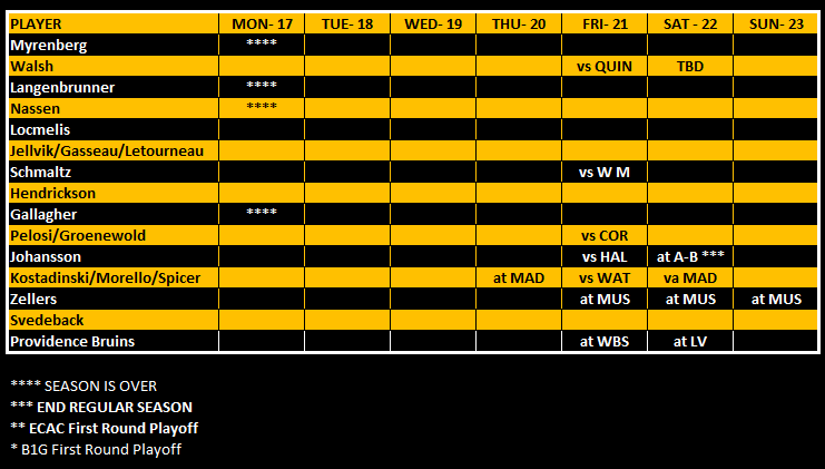 Quinnipiac won the opener of the ECAC Quarterfinals by a score of 4-1 over Brown. Groenewold had the secondary assist on the game winning goal while Pelosi potted an empty netter to clinch the win. Groenewold finished a plus-2 with 1 SOG and led Quinnipiac with 24:39 TOI. Pelosi was a plus-1 with 2 SOG and 6 for 16 on the dot with 20:30 TOI.