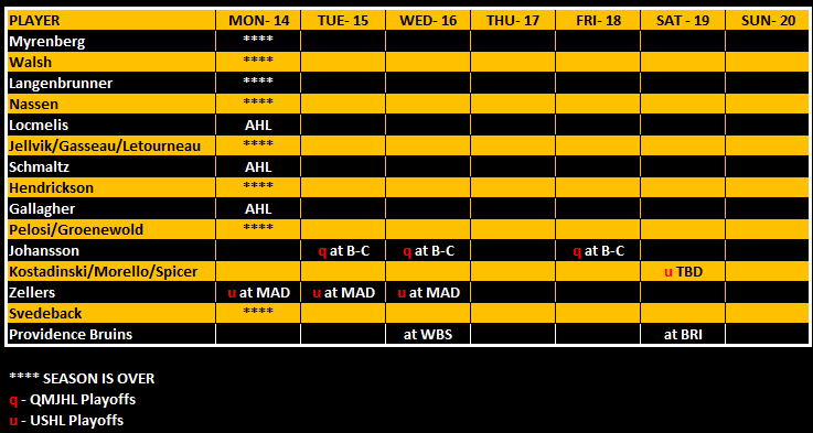 Green Bay dropped their final regular season game 6-5 to Madison in what was a preview of the USHL first round matchup. Zellers had zeroes across the board. He finished the season with 44 goals and 71 points in 52 games. He led the league in goals and was third in pints despite playing in 10 fewer games. His 1.37 PPG led the league. Green Bay will now face Madison in a best of three series Monday and Tuesday with game 3, if necessary, on Wednesday. The winner will face Dubuque.
