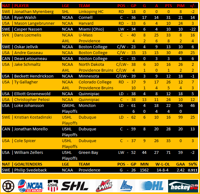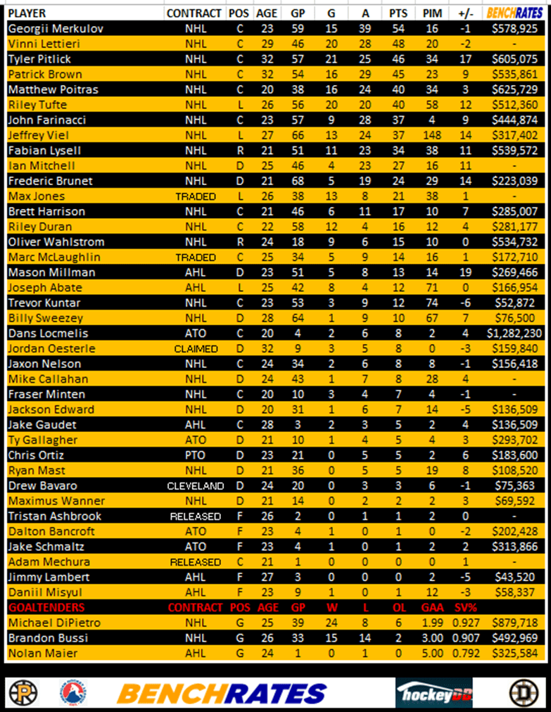 Here’s a look at the Providence Bruins leaders. You will notice a column called “Benchrates” This is provided by our friends at Benchrates. Created by a retired hockey player, Benchrates has created an algorithm that computes values in real time. The value you see is the cap hit value they’ve earned this season to date. Give them a look and check out their site.