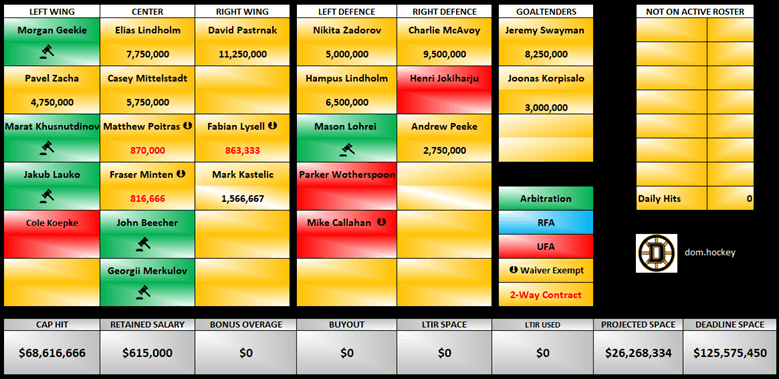 Outlined below is the Bruins’ cap situation for the upcoming offseason. It is important to note that the players listed are not necessarily projected to be part of the final roster. For cap purposes, the team must have a minimum of 20 players listed, either signed or classified as restricted free agents with arbitration rights.