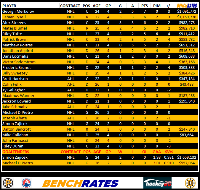 Here’s a look at the Providence Bruins leaders. You will notice a column called “Benchrates” This is provided by our friends at Benchrates. Created by a retired hockey player, Benchrates has created an algorithm that computes values in real time. The value you see is the cap hit value they’ve earned this season to date. Give them a look and check out their site.