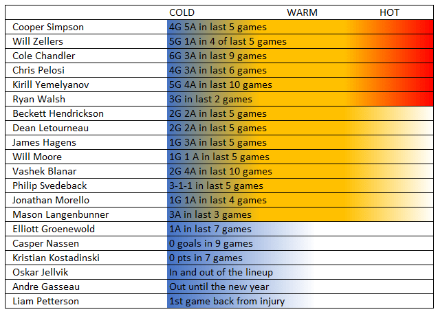 Will Moore had an assist and was 7 for 10 on the dot with 16:55 TOI. He is quietly having a good freshman season. Kostadinski is still seeing limited ice time. He did manage a shot on goal in 6:40 TOI.