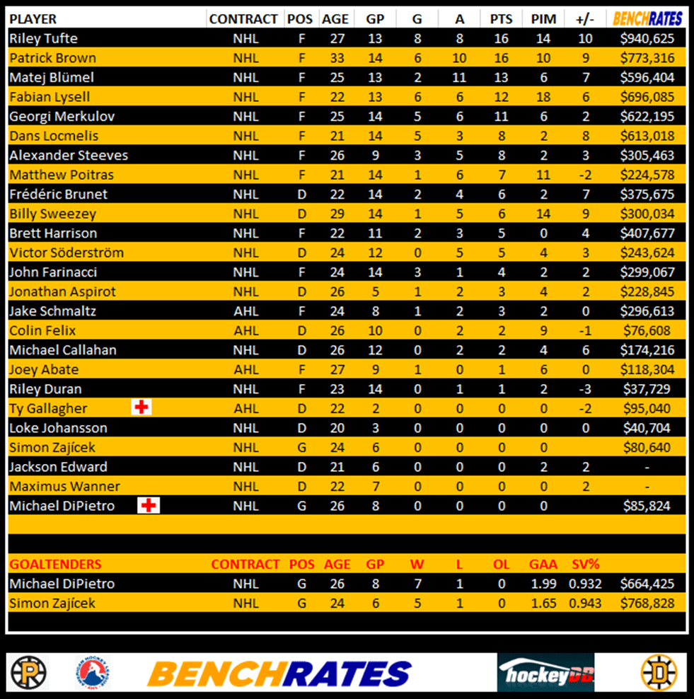 Here’s a look at the Providence Bruins leaders. You will notice a column called “Benchrates” This is provided by our friends at Benchrates. Created by a retired hockey player, Benchrates has created an algorithm that computes values in real time. The value you see is the cap hit value they’ve earned this season to date. Give them a look and check out their site.