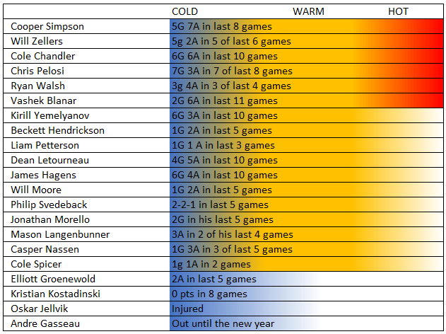 Will Moore had an assist in this one while Kristian Kostadinski had zeroes across the board. Jellvik and Gasseau are still out due to injury.