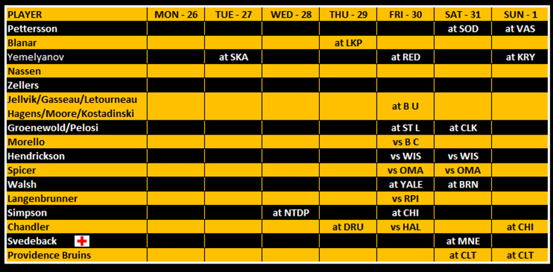 Svedeback remains out with an injury that will keep him out for at least another month. He’s missed 5 games now and Providence’s record since then: 5-0-0. Svedeback’s record: 8-6-2.