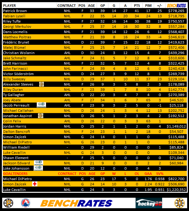 Here’s a look at the Providence Bruins leaders. You will notice a column called “Benchrates” This is provided by our friends at Benchrates. Created by a retired hockey player, Benchrates has created an algorithm that computes values in real time. The value you see is the cap hit value they’ve earned this season to date. Give them a look and check out their site.