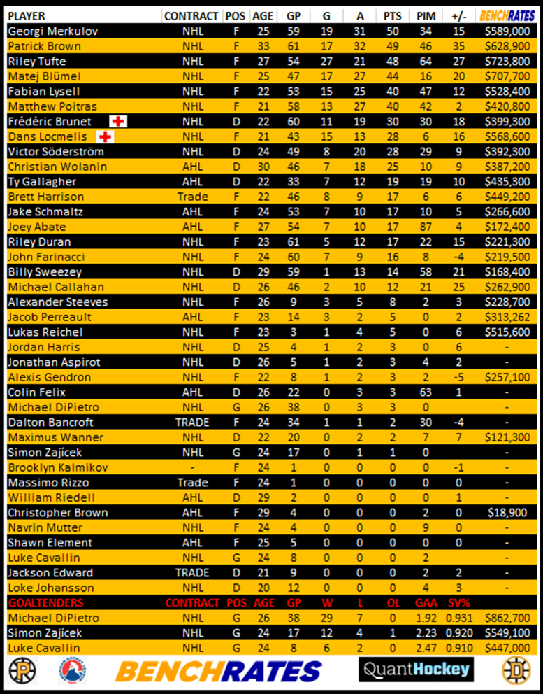 Here’s a look at the Providence Bruins leaders. You will notice a column called “Benchrates” This is provided by our friends at Benchrates. Created by a retired hockey player, Benchrates has created an algorithm that computes values in real time. The value you see is the cap hit value they’ve earned this season to date. Give them a look and check out their site.